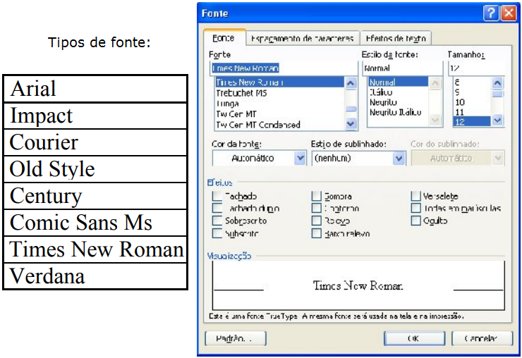 Estilo da Fonte: São as variações. Negrito, Itálico, Sublinhado. Você pode utilizar os três estilos ao mesmo tempo. Ex: Aprendendo Informática