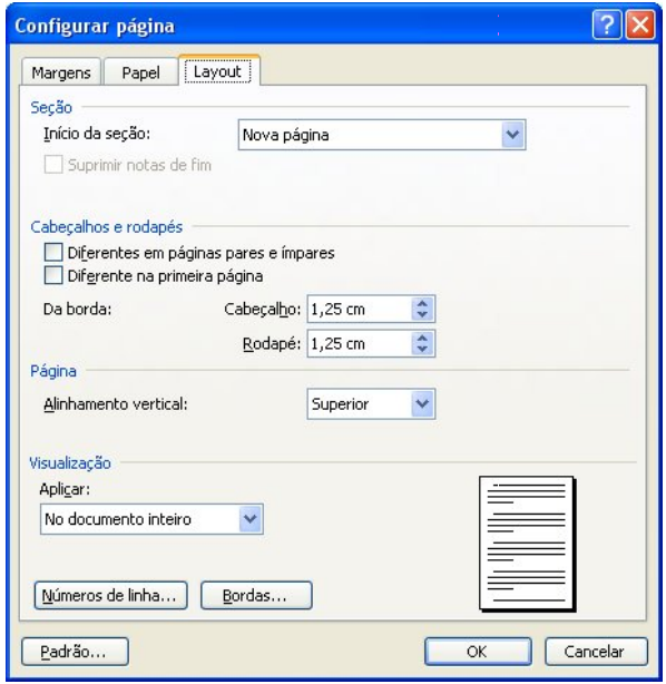Para colocar cabeçalhos diferentes e ou alternados, clique no meu Arquivo/Configurar página e escolha a guia Layout. Você pode configurar um cabeçalho ou rodapé diferentes em Diferentes em páginas pares e ímpares ou um cabeçalho Diferente na primeira página, podendo digitar um texto na primeira página e a partir da segunda página outro texto. Na opção Da borda, você controlar a distância do cabeçalho ou rodapé com relação a página. Depois de inserido o Cabeçalho e rodapé, para editá-los, basta clicar duas vezes sobre eles, tanto no cabeçalho quanto no rodapé. Você pode formatar o cabeçalho da maneira que achar melhor, com fontes e cores como num texto normal.