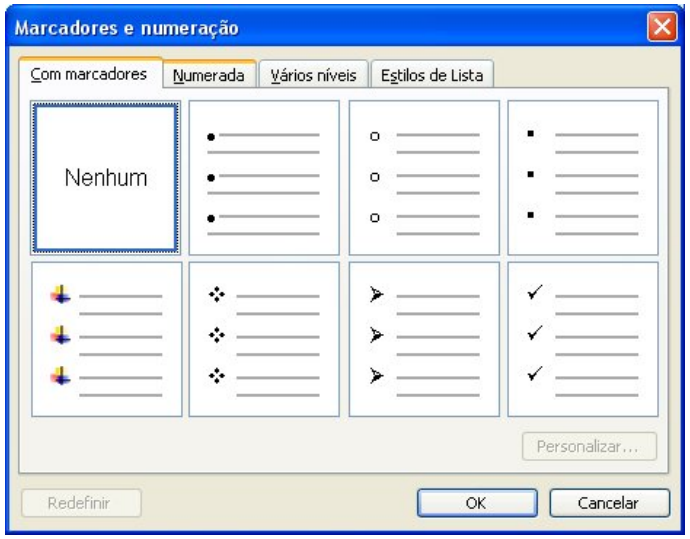 Para escolher um marcador diferente, clique no menu Formatar/Marcadores e Numeração. A caixa abaixa será aberta: