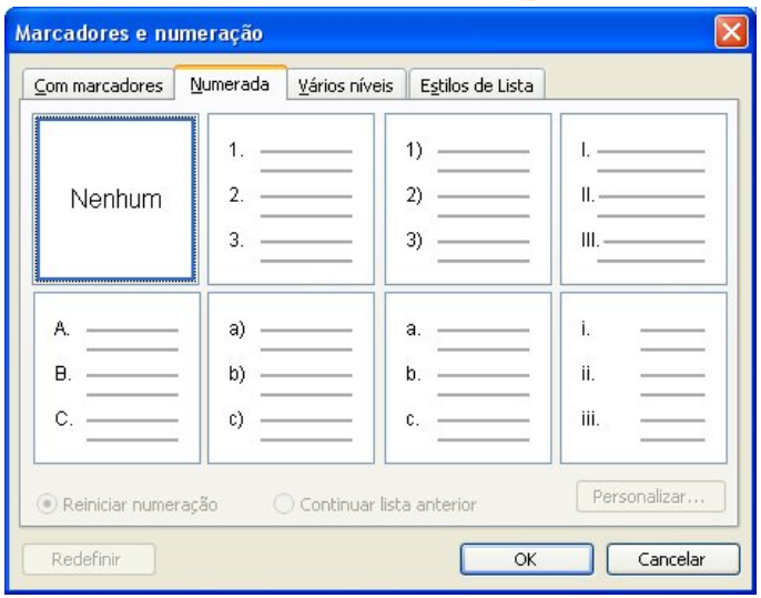 Escolha o estilo desejado e em seguida clique em OK. Você também pode personalizar sua lista de marcadores. Para isso, clique no botão Personalizar. Numeração Para inserir numeração no seu texto, selecione os parágrafos desejados e em seguida clique no botão Numeração, na barra de formatação.