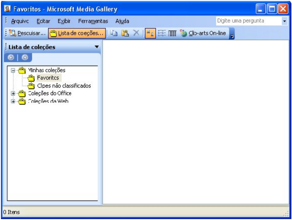 A barra lateral surgirá do lado direito da tela. Na caixa Procurar por, digite o nome de uma figura e em seguida clique no botão Ir. Onde há “Pesquisar em” escolha quais Clip-arts você deseja visualizar. Para inserir um Clip-art, posicione o mouse sobre a imagem desejada, clique sobre a seta que aparece e em seguida em Inserir. Em Organizar clipes, a caixa abaixo será exibida. Através dela você pode organizar seus clipes, visualizar clipes na Internet e inserir clipes instalados no computador.