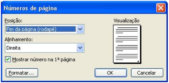 Clique no menu Inserir/Números de Página. Escolha a posição (Inicio ou fim da página) e o alinhamento (esquerda, direita ou centralizada). Caso a primeira página do documento seja a capa do seu trabalho, ou por qualquer outro motivo você não queira numerá-la, desmarque a caixa de verificação “Mostrar número na 1ª Página”, deste modo, a numeração começara da segunda página.