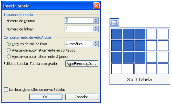 Outra maneira de criar Tabelas é através do botão Inserir Tabela. Ao clicar sobre este botão, aparecerão opções como abaixo: Os pequenos quadrados abaixo representam as linhas da tabela e os quadrados à direita representam as colunas.