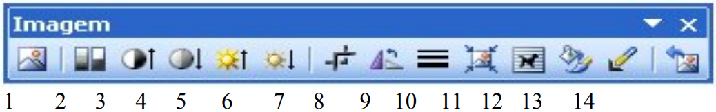 A Barra de Ferramentas Imagem deverá aparecer toda vez que você selecionar um desenho. Caso isso não aconteça, clique no menu Exibir/Barra de Ferramentas/Imagem. As Ferramentas dessa barra são: