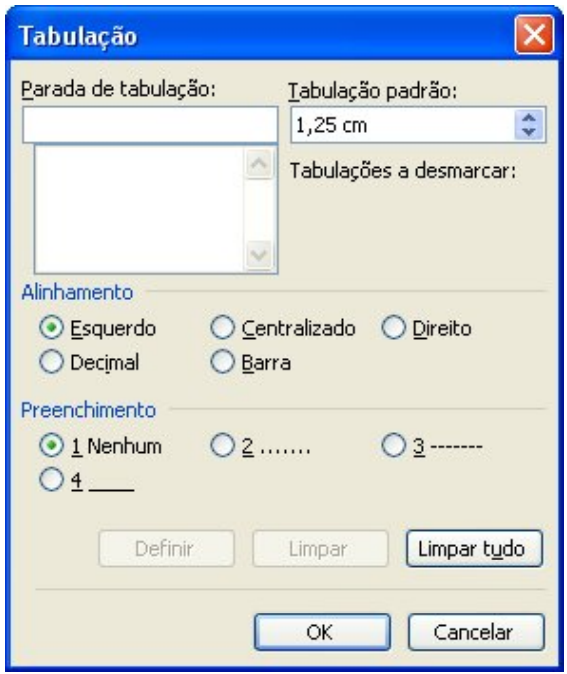 Clique sobre a régua para inserir as tabulações desejadas. Para escolher outras opções de Tabulação, clique no menu Formatar/Tabulação. A caixa abaixo se abrirá: