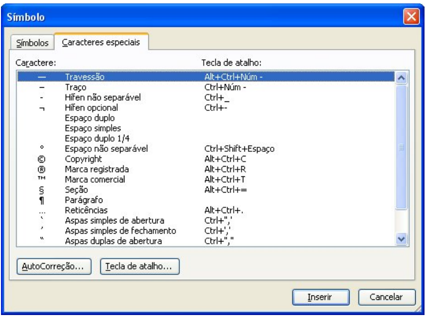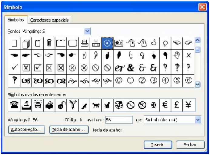 Muitos documentos exigem caracteres especiais. O Word possui uma grande relação de símbolos disponíveis para seu uso. Clique no menu Inserir/Símbolo. A caixa seguinte será aberta: