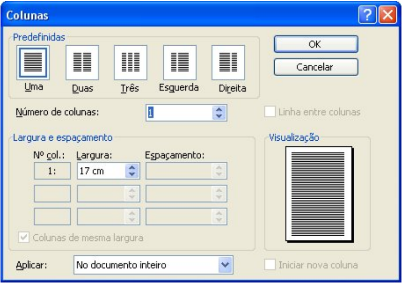 Clique no botão Colunas, na barra de ferramentas Padrão , ou clique no menu Formatar/Colunas e a caixa abaixo se abrirá: Em Predefinidas, escolha o estilo de suas colunas.
