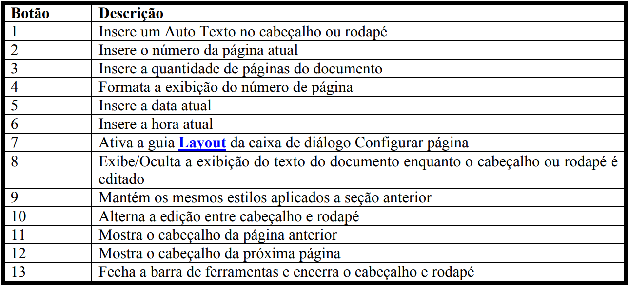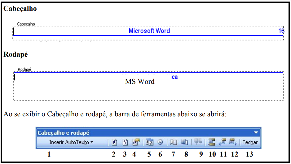 Um cabeçalho ou rodapé é um pequeno texto ou elemento gráfico que normalmente aparece na extremidade ou no topo de todas as páginas do documento, sendo que o cabeçalho é impresso na parte superior e o rodapé na parte inferior da página. Para incluir um cabeçalho, clique no menu Exibir/Cabeçalho e rodapé.