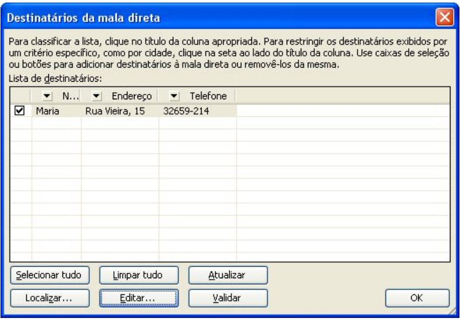 A caixa abaixo se abrirá mostrando todos os clientes cadastrados. Para classificar esses nomes em ordem alfabética, crescente ou decrescente, clique no título da coluna. Para não incluir um registro na mala direta, desmarque a caixa de seleção posicionada no início dos registros. Para digitar, excluir ou editar os registros clique no botão Editar. Ao terminar confirme com OK. Clique na opção Próxima.