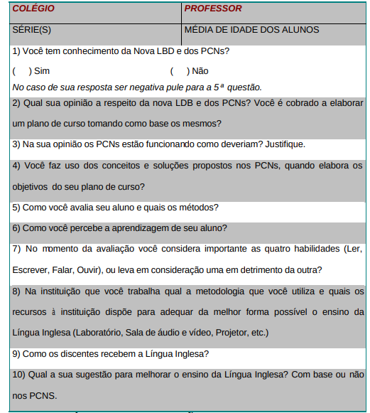 Este questionário tem por objetivo: verificar a realidade do ensino da Língua Inglesa nas escolas de ensino médio.