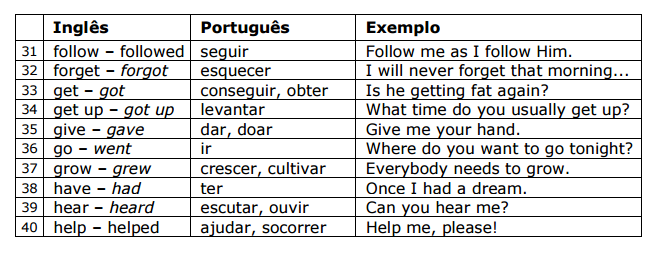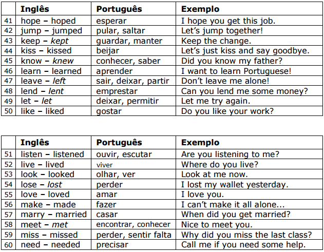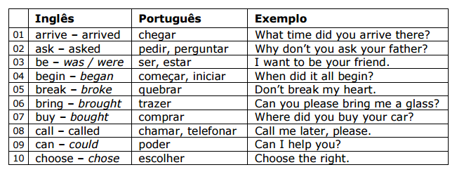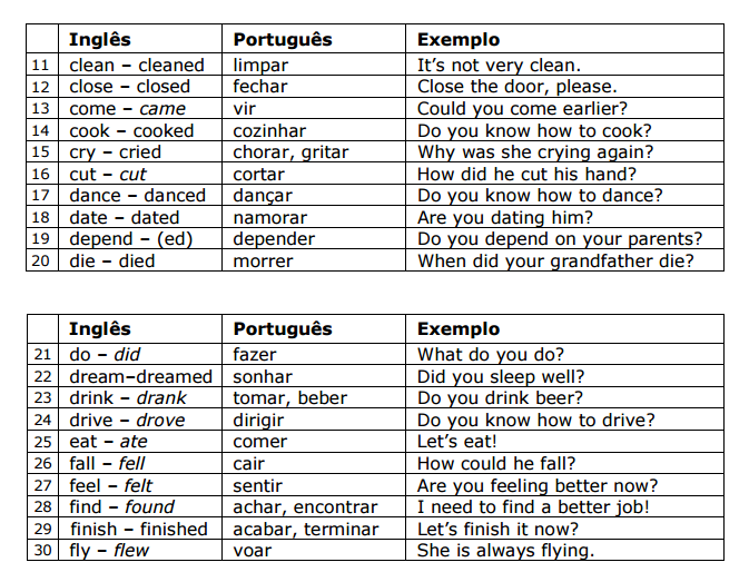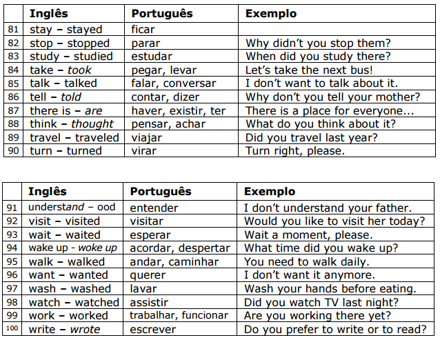 Aqui você encontrará os 100 verbos mais comuns da língua inglesa, divididos em grupos de 10. Cada verbo vem acompanhado de sua respectiva tradução e uma frase modelo. Os verbos irregulares estão destacados em itálico.
