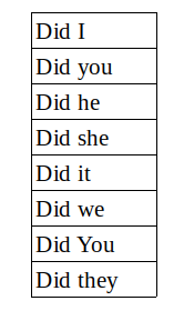 Nessa tabela, vemos como ficam os pronomes acompanhados do auxiliar DID nas frases interrogativas.