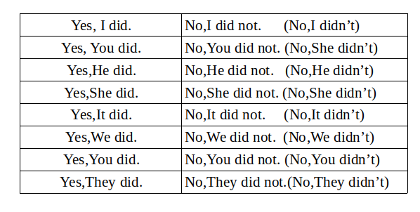 Vejamos a tabela abaixo com as short answers do verbo DID (afirmativa e negativa).