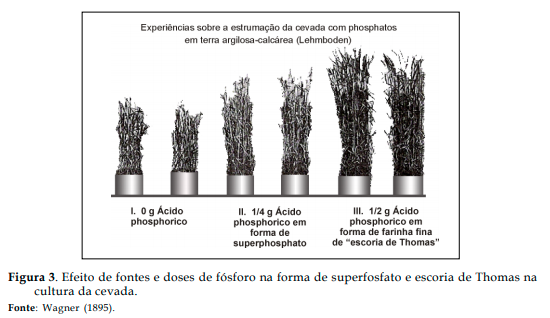 phosphorico em forma de superphosphato e ½ g de acido phosphorico em forma de farinha fina de escoria de Thomas, comparado com o tratamento testemunha, sem acido phosphorico, em vasos que foram estrumados com azoto e potassa. Fica-se a imaginar o sucesso que uma publicação como essa deve ter tido naquela época!