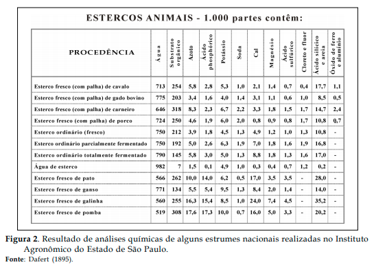 As análises químicas, realizadas no então Instituto Agronômico do Estado de São Paulo, hoje IAC, envolviam a determinação em partes por mil de “água, substancias orgânicas, azoto, acido phosphorico, potassa, soda, cal, magnésia, acido sulfúrico, chloro e flúor, acido silícico e areia, oxido de Fe e alumina” nos mais diferentes tipos de estercos animais produzidos nas fazendas: compostos, excrementos humanos, casca de café, palhas de milho e feijão, turfa, bagaço de cana, restos de criação (ossos, chifres, cabelos, sangue, etc.), além de outros estrumes como resíduos da fabricação do gás de iluminação, apatita, cinzas de bagaço de cana, resíduos de destilação da cana, bagaço de sementes de oleaginosas, restos de curtume e serragem (Figura 2).
