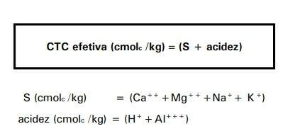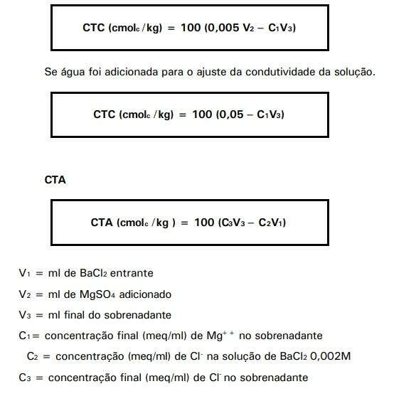 A CTC do solo é definida como sendo a soma total dos cátions que o solo pode reter na superfície coloidal prontamente disponível à assimilação pelas plantas. Estes cátions adsorvidos são removidos por soluções salinas de amônio, cálcio, bário e soluções de ácidos diluídas e posteriormente determinados por métodos volumétricos, de emissão ou absorção atômica.