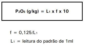 - para a obtenção direta da concentração de P (mg/kg) no solo, o fator Fp deve ser multiplicado por 10, considerando que a concentração de fósforo na amostra sofreu diluição de 1:10 na extração.