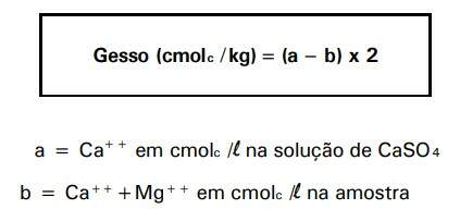 Solução saturada de sulfato de cálcio - pesar 5g do CaSO42H2O, colocar em garrafa contendo um litro de água. Agitar várias vezes ou utilizar agitador circular durante 10 minutos. Filtrar e pipetar 5 ml do filtrado límpido; dosar o cálcio nessa alíquota e calcular a concentração desse íon em cmolc /l, que deve ser da ordem de 28 cmolc /l Ca++.