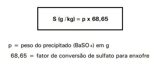 Ataque da amostra com HCl 1:1, precipitação com BaCl2, calcinação do BaSO4 e determinação gravimétrica do precipitado. Esta determinação aliada ao baixo pH serve de referência para a caracterização de solos tiomórficos.