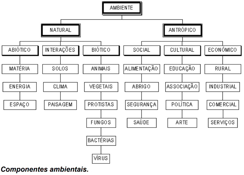O ambiente, do ponto de vista antrópico, é o espaço em que os seres humanos vivem e ao qual se denominou: Terra. Alguém poderá perguntar: e os animais e as plantas? E as rochas, a água e o ar? – Resumindo: e a biosfera? – É verdade! Todos são importantes; mas para nós, seres humanos, o importante é o ambiente que utilizamos para viver e, até o presente, ele se chama Terra. Alguém ainda poderá contestar: mas, não é a biosfera terrestre? – Bem, com algumas exceções, é; mas, usamos coisas do subsolo, abaixo da biosfera, andamos em aeroplanos, acima da biosfera e alguns malucos estão vivendo em uma estação orbital.