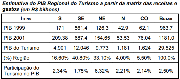 De acordo com o FIPE, o PIB direto do Turismo representa 2,5% do PIB brasileiro. Na Tabela 8 é apresentado o PIB do turismo estimado por região.