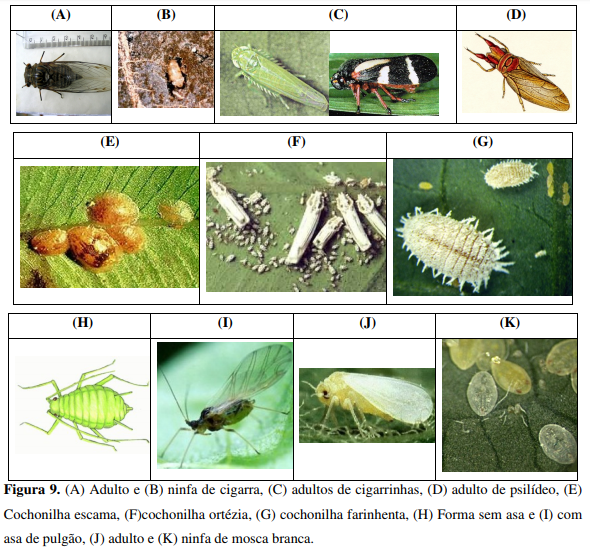 - Cigarras: os adultos possuem asas membranosas transparentes e os machos cantam para atrair as fêmeas (Figura 9A). Na fase jovem (ninfas) atacam as raízes das plantas (Figura 9B).