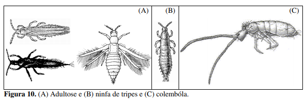 Os adultos (0,5 a 13 mm de comprimento) possuem asas franjeadas e aparelho bucal sugador (Figura 10A), enquanto as formas jovens (ninfas) não possuem asas (Figura 10B). Quando observados a campo nas amostragens realizadas pela batida de ponteiros de plantas em bandejas plásticas brancas, eles se parecem muito com um grupo de insetos recicladores da matéria orgânica os colêmbolas. Entretanto, os colêmbolas possuem maior tamanho e antena maior que os tripes (Figura 10C).