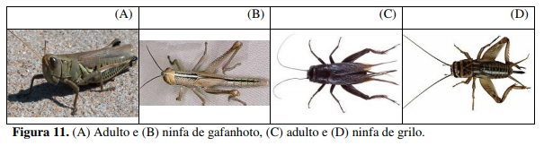Os ortópteros mais importantes são os grilos e os gafanhotos, ambos possuem o último par de pernas saltatória e na fase adulta seu primeiro par de asas é semelhante a asas de baratas (tegminas). Os grilos possuem coloração escura e as asas dos adultos quando em repouso assumem posição horizontal (Figura 11A), eles tanto na fase jovem (ninfas) (Figura 11B) como adulta atacam plantas pequenas cortando-as rente ao solo. Já os gafanhotos possuem diversas colorações e as asas dos adutos, quando em repouso assume uma posição inclinada (Figura 11 C). Tanto os adultos com a fase jovem (ninfas) (Figura 12 D) dos gafanhotos causam desfolha as plantas.