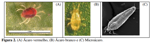 Eles são de tamanho pequeno (para vizualizá-los é necessário o uso de lupa com aumento de pelo menos 10 vezes), quatro pares de pernas e sugam o conteúdo das células das plantas. As folhas atacadas por ácaros ficam retorcidas (“encarquilhadas”), com coloração alterada e com pontuações esbranquiçadas. Os principais grupos de ácaros-pragas de plantas são: os ácaros vermelhos, os ácaros brancos e os microácaros.