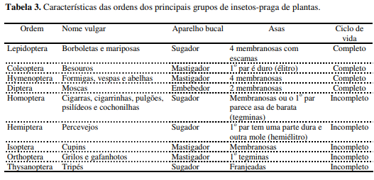 As principais características dos insetos são: corpo dividido em três partes, pernas e antenas articuladas, exoesqueleto, simetria bilateral, circulação sanguínea (hemolinfa) livre, sistema respiratório formado por tubos que atingem a parte externa do corpo por orifícios, um par de antenas, três pares de pernas, desenvolvimento por metamorfose e asas geralmente presentes nos adultos. Na Tabela 3, estão listadas as características das ordens dos principais grupos de insetos-praga de plantas.