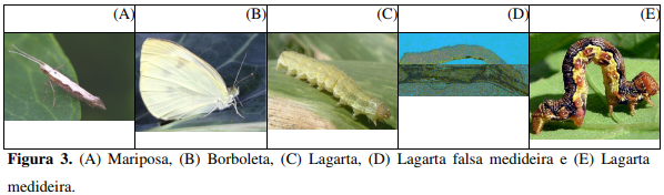 Seus adultos são chamados de mariposas (noturnos e de cores não aparentes - Figura 3A) ou borboletas (diurnos e de cores vistosas - Figura 3B), possuem asas membranosas com escamas e aparelho bucal sugador. Suas larvas são chamadas de lagartas e possuem cabeça visível, três pares de pernas no início do corpo e pernas no final do corpo (Figuras 3C,3D e 3E). Eles são pragas na fase de lagartas que possuem aparelho bucal mastigador.