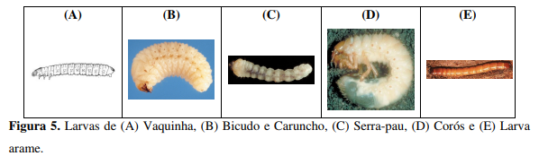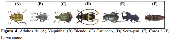 - Vaquinhas: os adultos geralmente possuem corpo colorido, antenas visíveis e causam desfolha (Figura 4A). Suas larvas são finas, esbranquiçadas e possuem três pares de pernas e geralmente atacam órgãos subterrâneos principalmente raízes (Figura 5A).