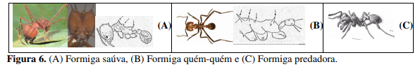 - Formigas saúvas: estas formigas pertencem ao gênero Atta, possuem ninhos com grande quantidade de terra solta e três pares de espinhos no seu dorso (Figura 6A).