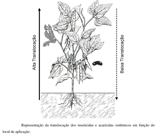 Os inseticidas de contato agirão controlando as pragas no local de sua aplicação. Já os produtos de ação translaminar, controlarão insetos e ácaros presentes na face inferior da folha mesmo quando pulverizados na face superior das folhas. Já os produtos de ação sistêmica se translocarão no sistema vascular da planta podendo controlar pragas sugadoras, minadoras em partes da planta em que o produto não foi aplicado. Entretanto, verifica-se que o local de aplicação influenciará grandemente a movimentação do inseticida e acaricida na planta.