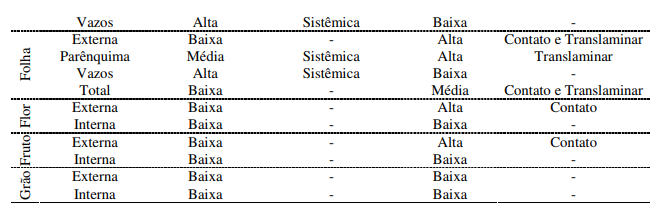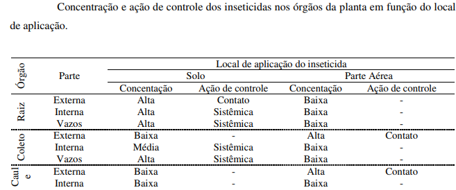 A seguir, é mostrada de forma esquemática uma planta de feijão com os seus órgãos os quais podem ser atacados por insetos e ácaros-praga. Como também a concentração e ação de controle dos inseticidas nos órgãos da planta em função do local de aplicação.