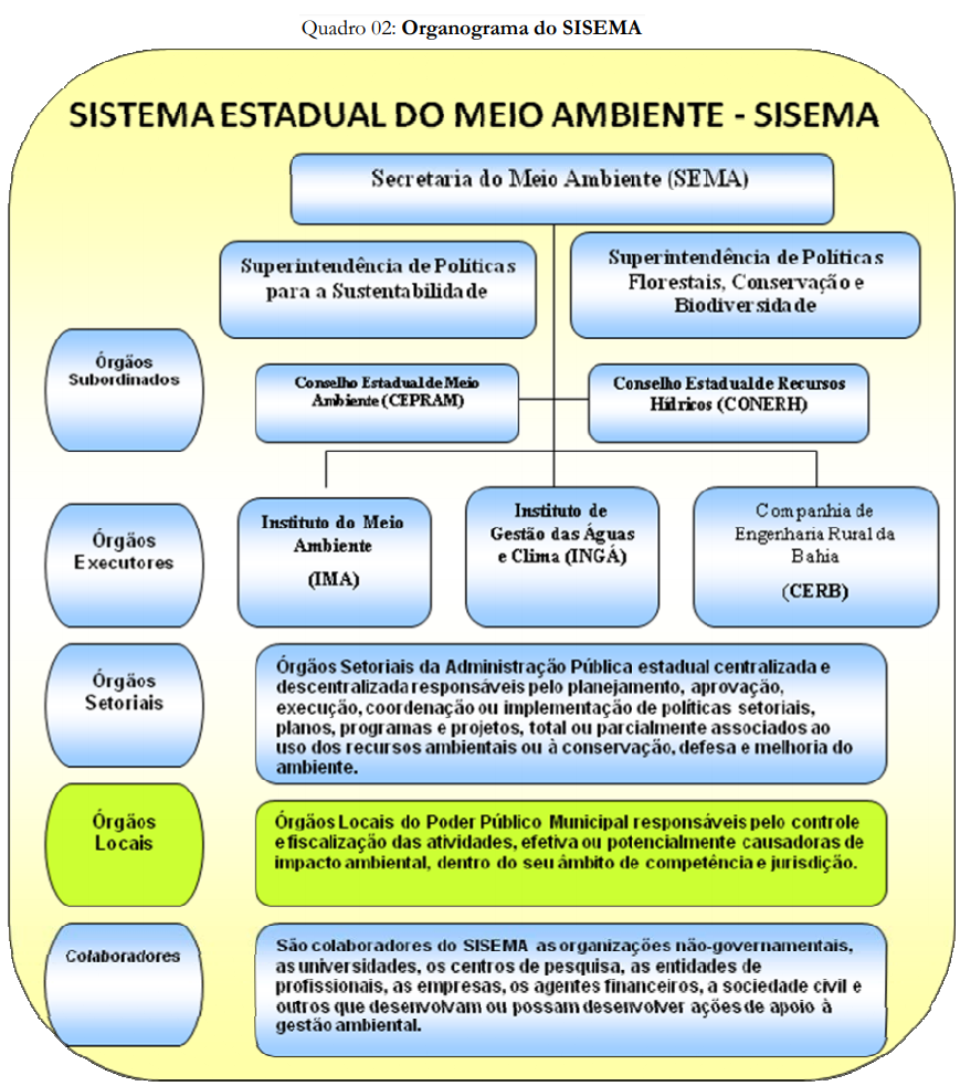 Para desempenhar esse papel cabe às administrações municipais estruturarem-se para a implementação e aperfeiçoamento de um sistema próprio de controle ambiental, que envolva os aspectos: legal, institucional, técnico e operacional, de modo a atender às exigências de uma ação eficiente e eficaz no trato das questões ambientais locais. Nesse sentido, reforça os dispositivos da lei ambiental da Bahia, considerando que o município deve organizar-se para exercer a competência a ele atribuída, devendo observar a existência dos seguintes requisitos:
