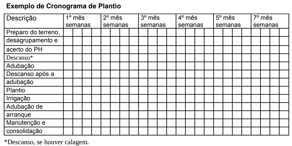 O cronograma deve apresentar as etapas previstas para o plantio. Observa-se contudo, que o tempo previsto para cada etapa depende do porte do projeto e dos recursos disponíveis. A limpeza do terreno, o combate à pragas e/ou à vegetação competidora e o preparo do solo, devem ser feitos antes do período de chuvas (de novembro a março). Recomenda-se o plantio na época das chuvas : outubro a março