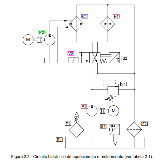 Observando a válvula direcional (V1) presente na figura 2.3, o comportamento pode ser descrito como: ‘o Fluido proveniente da bomba é direcionado para o resfriador (C1) quando o solenoide está acionado. Quando o solenoide está desenergizado, o fluido é direcionado para aquecedor (H1).