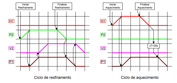 Na figura 2.4 apresenta-se o diagrama trajeto-passo do sistema de atuação em temperatura o qual descreve a sequência com que os componentes presentes na figura 2.3 são ligados ou desligados de acordo com os ciclos de aquecimento e de resfriamento. A decisão de quando aquecer ou resfriar não está representada nestes diagramas pois será aleatória dependendo da operação da UPCH e atendendo a especificação da figura 2.2. Destaca-se na figura 2.4 a existência de um retardo entre a desativação do aquecedor (H1) em relação a bomba hidráulica (P1), procurando evitar a degradação do fluido hidráulico em função do sobreaquecimento junto as paredes do aquecedor.