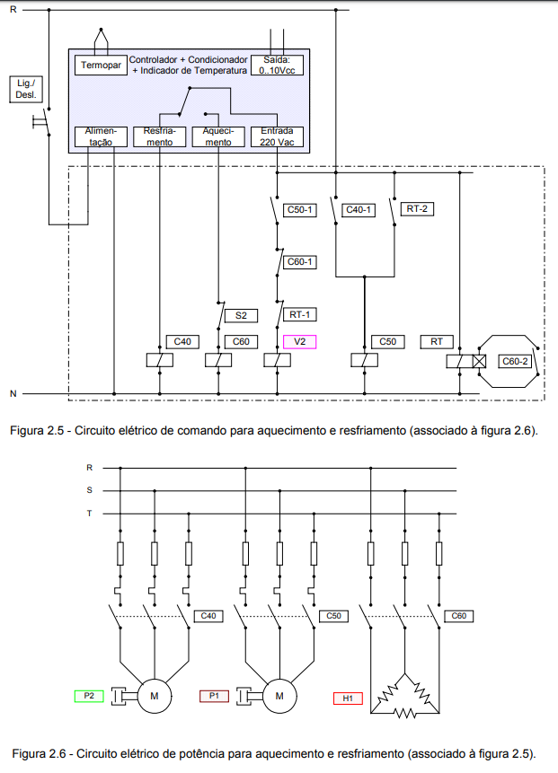 2.3) e no diagrama trajeto-passo (figura 2.4). Normalmente há necessidade da participação do especialista em hidráulica/integrador para transmitir as informações não explicitadas nestes diagramas para que o especialista em controle de processos e eletricidade possa adquirir uma visão global do problema. O resultado desta etapa de projeto é uma lista preliminar de especificações de componentes elétricos, bem como do circuito elétrico de aquecimento e resfriamento conforme as figuras 2.5 e 2.6.