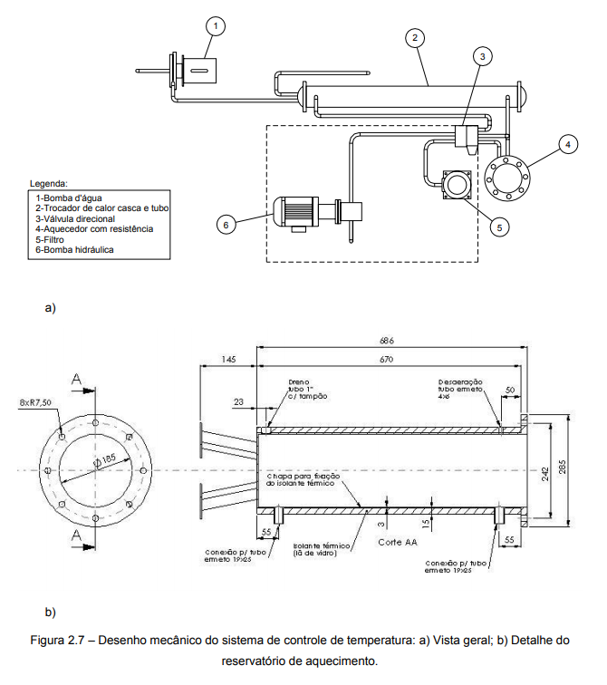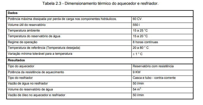 Com base nos circuitos concebidos, é realizado o dimensionamento dos componentes hidráulicos e elétricos, incluindo o aquecedor e resfriador. Como exemplo, o dimensionamento do aquecedor e resfriador podem ser efetuados por um especialista da área térmica que, fundamentado nos conceitos da termodinâmica e transferência de calor e de posse de dados repassados pelo especialista em hidráulica como volume do reservatório, geração e dissipação térmica nos componentes hidráulicos da UPCH etc., determina as dimensões do resfriador, a vazão de água necessária, a potência da resistência de aquecimento etc. Nesta etapa do projeto, a transferência de informações entre os especialistas será realizada em linguagem natural, ou seja, listas de especificações conforme a tabela 2.3 que contém os dados empregados no dimensionamento e os resultados obtidos.