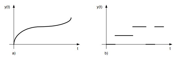 - o Modelos contínuos no tempo: neste caso, além da amplitude dos sinais ser contínua, a variável independente também é, ou seja, o sistema opera sobre entradas analógicas e produz saídas e estados analógicos; Matematicamente empregam-se equações diferenciais para descrever a relação entre as variáveis. Sistemas modelados desta forma são denominados sistemas contínuos no tempo;