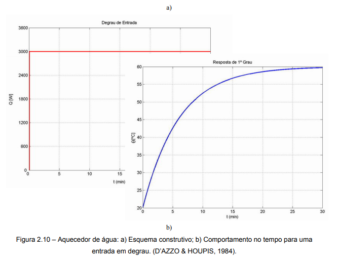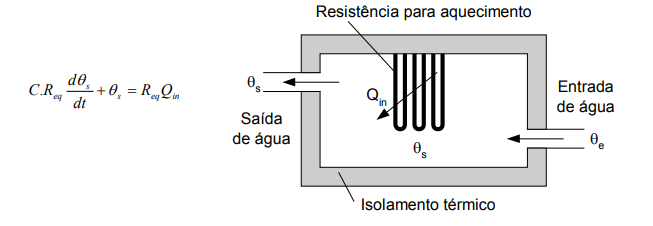 A figura 2.10 apresenta um aquecedor de água utilizado em residência para o fornecimento de água quente. O seu comportamento pode ser modelado como a estado contínuo no tempo aplicando-se princípios de transferência de calor. Considera-se que a água entra no aquecedor a uma temperatura θe igual à temperatura ambiente e que a resistência, quando ligada, produz um fluxo de calor Qin.