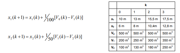 A tabela ao lado das equações apresenta os níveis alcançados nas barragens em função dos volumes de água. O instante t0 (k = 0) é o instante inicial.