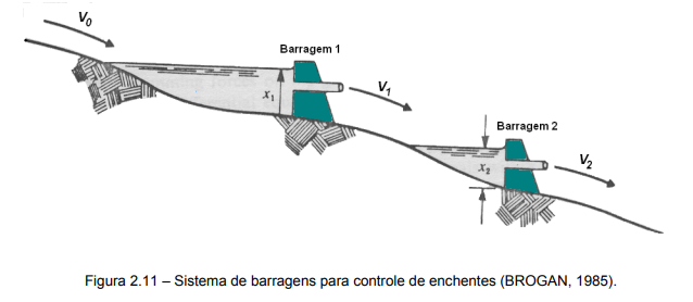 A figura 2.11 ilustra um exemplo de sistema cujo comportamento pode ser modelado como discreto no tempo. Refere-se a um par de barragens em um projeto para controle de enchentes. O nível da água na barragem 1 em um dado instante ‘tk’ é x1(0) e x2(0) é o nível na barragem 2 no mesmo instante. A quantidade de água coletada no reservatório 1 entre os instantes tk e tk+1 é V0(k). O volume de água que escoa das barragens 1 e 2 durante este período é denotado por V1(k) e V2(k) respectivamente. Em função das dimensões dos reservatórios, o sistema pode ser modelado pelas seguintes equações de diferenças: