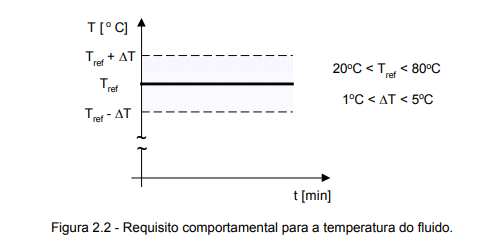 - Especificação em linguagem natural: Sistema destinado ao condicionamento térmico do fluido hidráulico contido no reservatório, mantendo a temperatura deste dentro de uma faixa de dispersão de ±1 °C a ±5 °C em relação à temperatura de referência. A temperatura de referência pode ser ajustada entre 20 e 80 °C, de acordo com os requisitos de utilização da UPCH e compatível com as temperaturas admissíveis de operação dos equipamentos instalados.