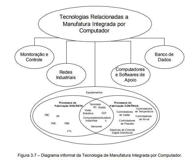 O diagrama entidade/relacionamento (Diagrama E/R) utiliza como elementos básicos os retângulos, onde se utilizam substantivos para designar as entidades ou objetos e os losangos que estabelecem os relacionamentos entre as entidades. A figura 3.6 descreve formalmente como está constituída a tecnologia de manufatura integrada por computador (CIM) onde, na parte superior há a especificação de cinco classes de tecnologia. Por sua vez, são identificados oito tipos de equipamentos que podem ser utilizados em processos de fabricação discretos e/ou contínuos.