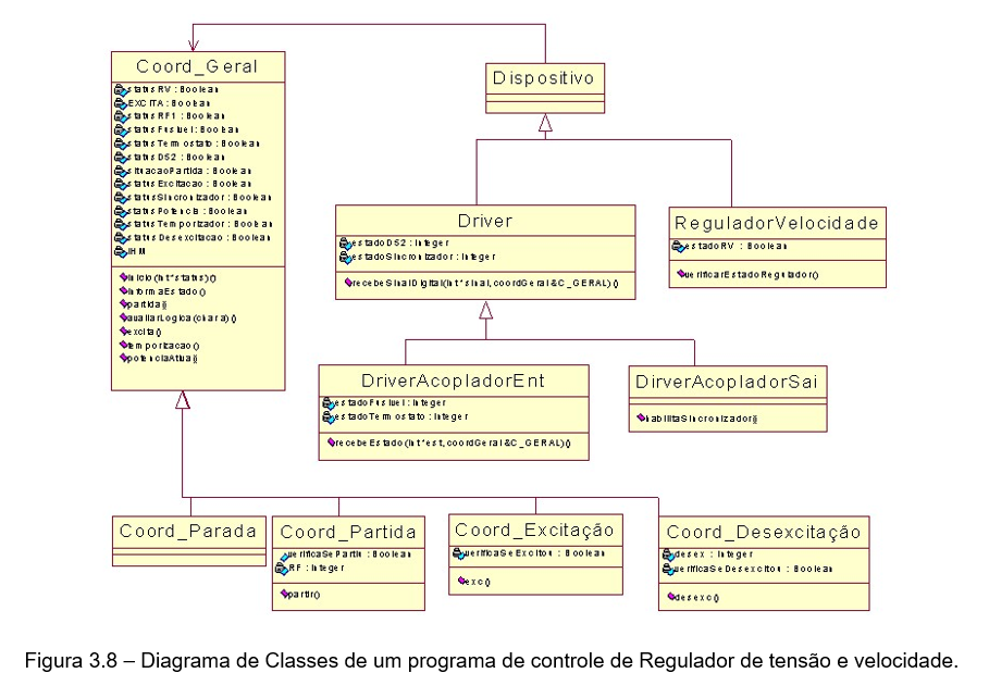 Na figura 3.8 está apresentado um diagrama de classes (BOOCH et al., 2000) que mostra a estrutura de um programa de controle de um regulador de tensão e velocidade para centrais hidrelétricas. As classes são identificadas pelo nome, atributos e operações que estas realizam, sendo que as interconexões estabelecem como o programa está estruturado (PAES & DE NEGRI, 2002).