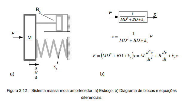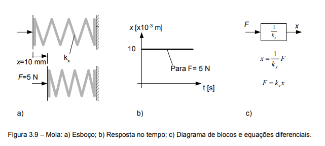 Na figura 3.9c está representado o diagrama de blocos expressando que a posição (saída) decorre da força aplicada (entrada) sobre a mola, a qual está representada pela expressão 1/kx. A equação escrita abaixo do diagrama de blocos é a forma matemática de representar este comportamento. Invertendo-se equação, pode-se determinar qual a força necessária para produzir um determinado deslocamento.