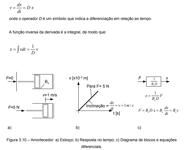 Para um amortecedor (figura 3.10), a aplicação de uma força promove o deslocamento com velocidade constante. Matematicamente, a força e a velocidade estão correlacionadas através do coeficiente de amortecimento viscoso (Bx). A velocidade corresponde à variação do deslocamento com o tempo, isto é, à derivada do deslocamento com o tempo: